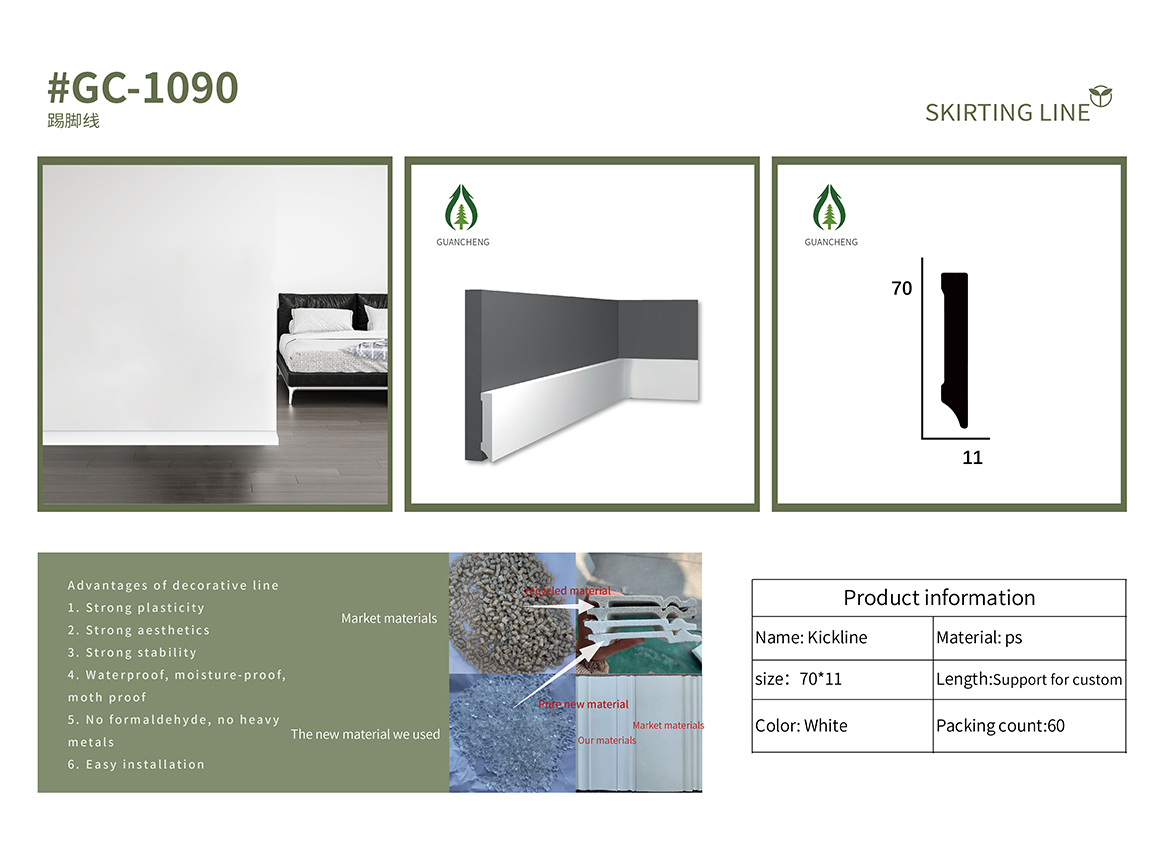 | 浙江 | 品牌名称 | 冠诚 | 型号 | GC1090 | 名称 | PS踢脚线 | 材料 | 聚苯乙烯 | 产品名称 | 踢脚板 | 颜色 | 定制颜色 | 用法 | 地板覆盖配件 | 尺寸 | 70 * 11毫米 | 应用领域 | 室内装饰 | 类型 | 地板设施 | 表面处理 | 抛光 | 关键词 | 踢脚板 |